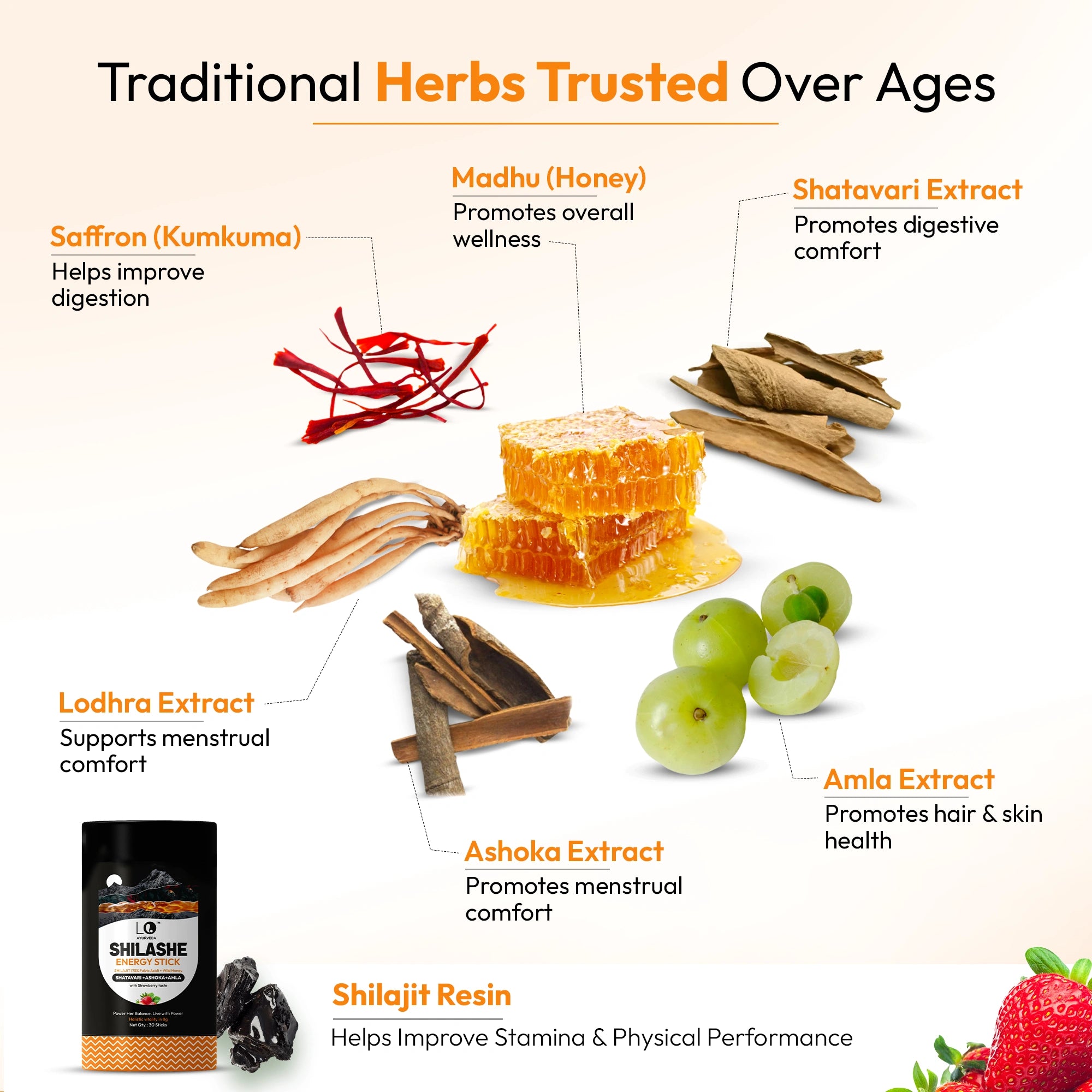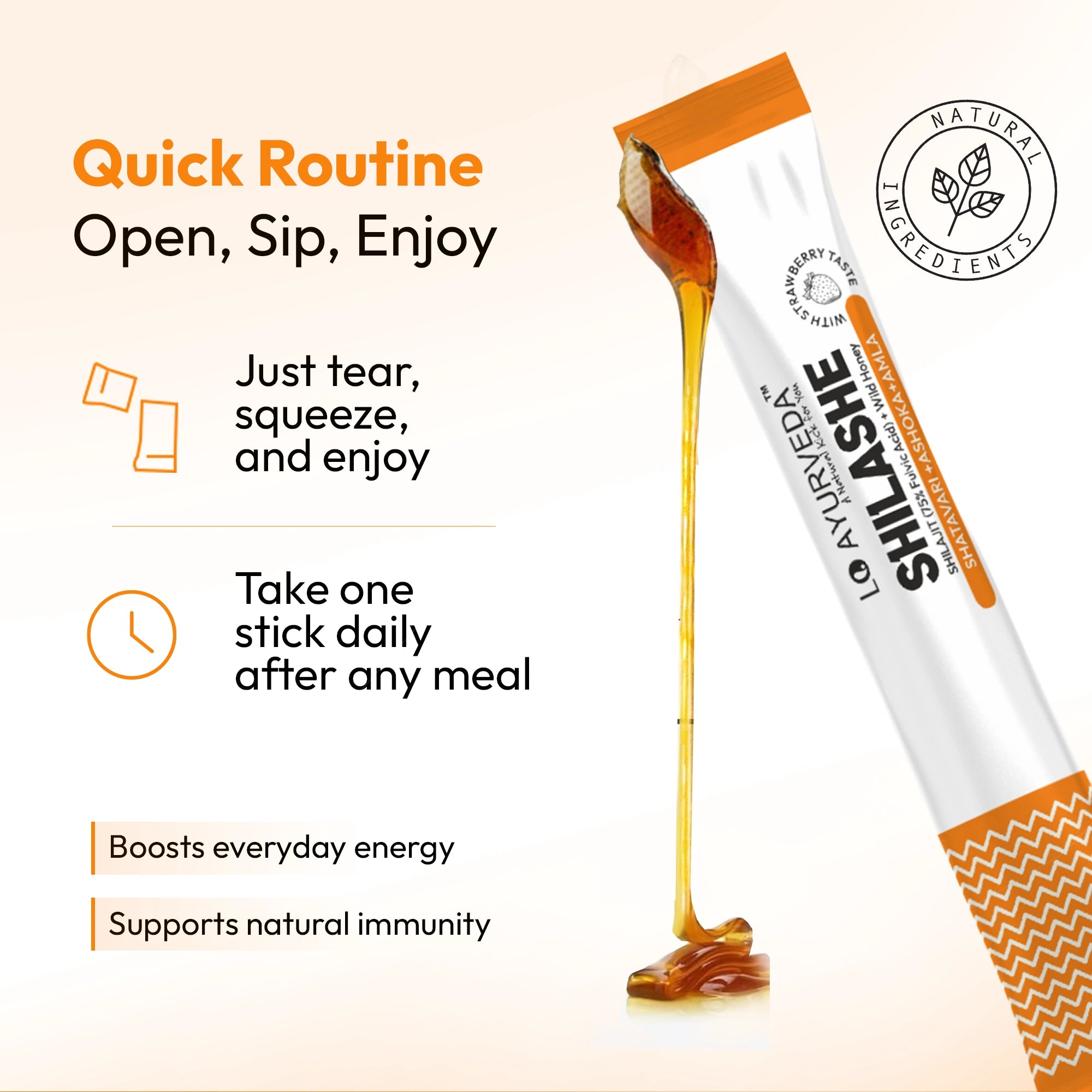 SHILASHE Energy Stick is a dietary supplement in convenient stick form made with Honey, Purified Shilajit, and a special blend of herbs like Shatavari, Ashoka, Amla, Lodhra, and Tulsi. It is formulated to support daily energy, vitality, and overall women’s wellness, especially during times when you feel tired, low, or mentally stressed.