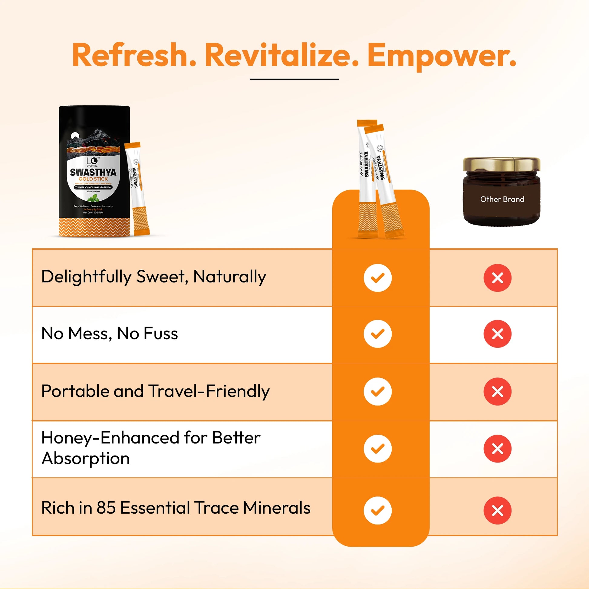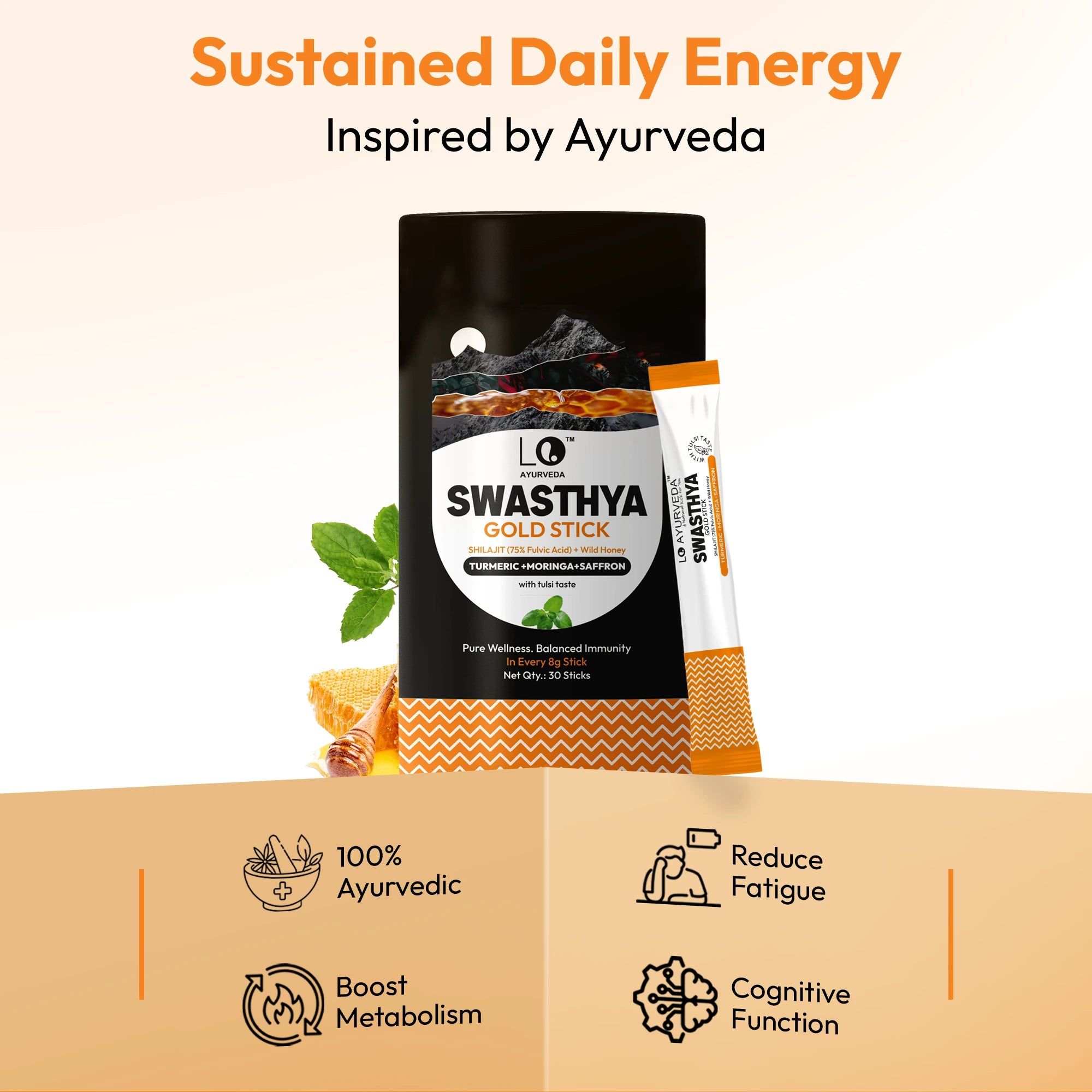 6-Swasthya Gold Stick is a daily wellness supplement in stick form made with a powerful blend of Honey, Purified Shilajit, Turmeric, Moringa, Ashwagandha, and Saffron, finished with a natural Tulsi flavour. It is formulated to support daily energy, strength, immunity, and overall well-being.